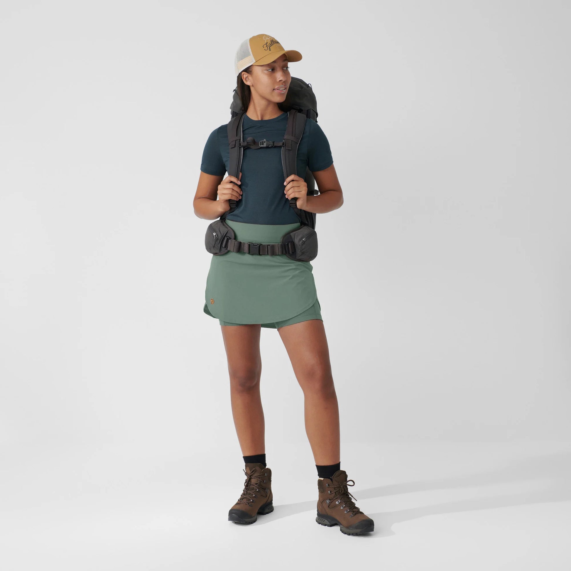 Possibly our most airy and practical warm-weather trekking garment for women; Abisko Midsummer Skort gives ease of movement on the summer trails. The petal-like construction of the skirt allows for long strides while the stretch shorts give full freedom of movement and have your rear covered in all situations. Made from sustainable and breathable fabrics that feel cool in hot climates. Leg pockets on the shorts let you store a map or other essentials close at hand.