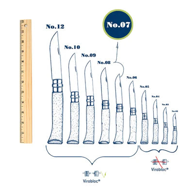 The goldilocks of the Opinel folding knife range, the No.07 is slightly smaller than the infamous No.08, but a bit bigger than the handy No.06. Often herald as the "perfect picnic knife", the No.07 slices through cheese and fruits with ease, and even looks good displayed on a charcuterie board. This size features the Virobloc® safety ring.